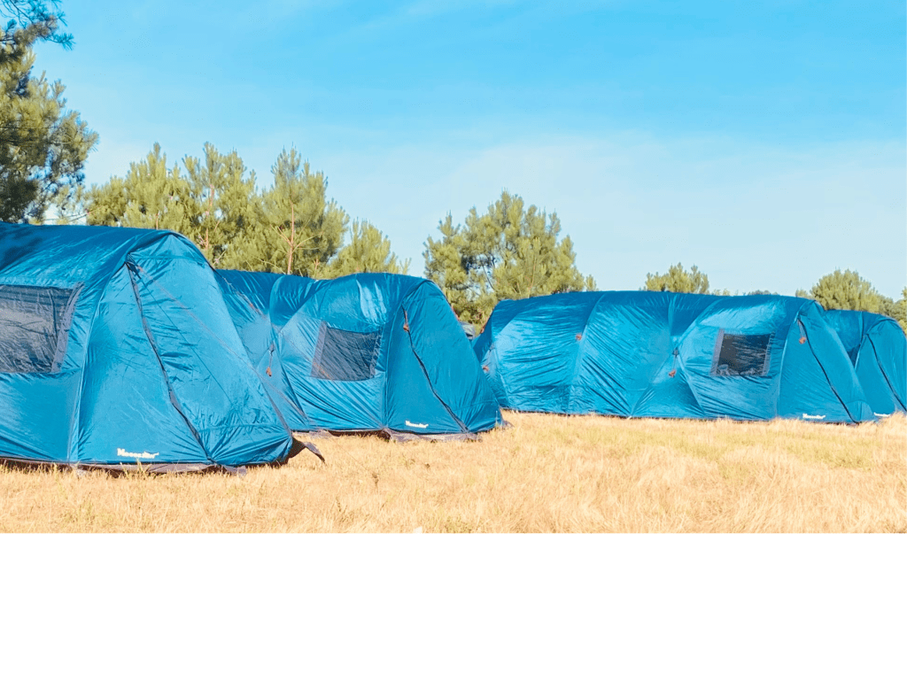 Make your campout easy and stress-free! Tent rentals include full set-up and breakdown, a tent rug, and a small tent table. Each 4-person tent comfortably sleeps 2 adults and can fit a queen air mattress. Guests should bring their own air mattress or sleeping pad, bedding, chairs, and any extra comforts. Use this link to reserve your tent.
